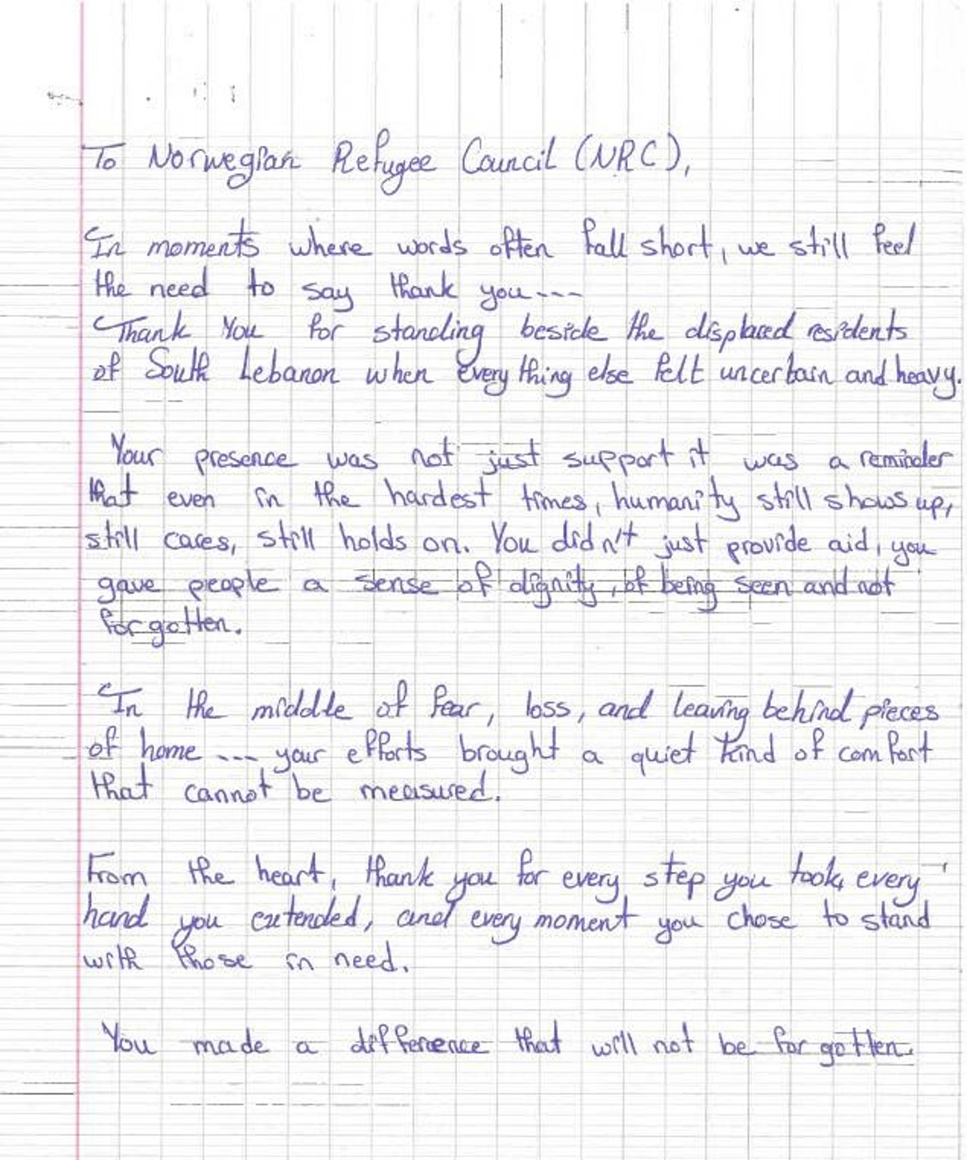 Den här veckan fick vi en stark och personlig hälsning från en person som lever på flykt i södra Libanon. Det är ett tack som också riktar sig till dig som genom ditt engagemang bidrar till att NRC kan finnas på plats för människor på flykt när behoven är som störst.