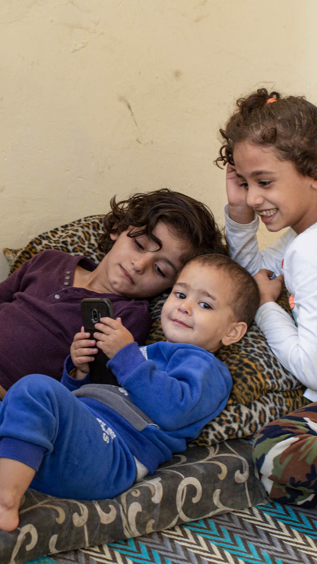 När storasyster Malak märkte att hennes småsyskon led av stress, fick hon dem att vara med på avslappningsövningar som hon hade lärt sig i NRC:s skolprogram Bättre lärande. Foto: Leen Qashu/NRC Flyktinghjälpen