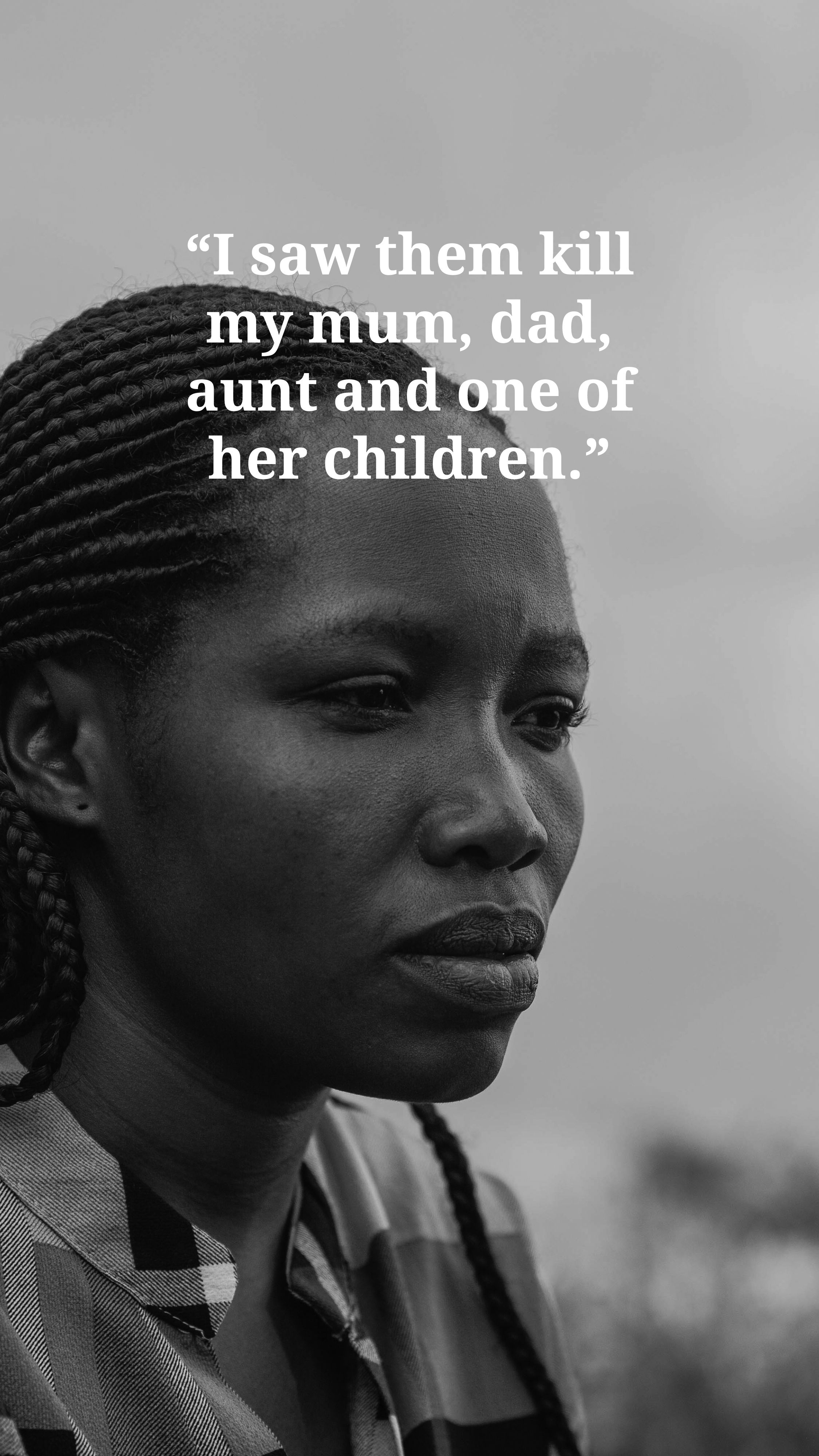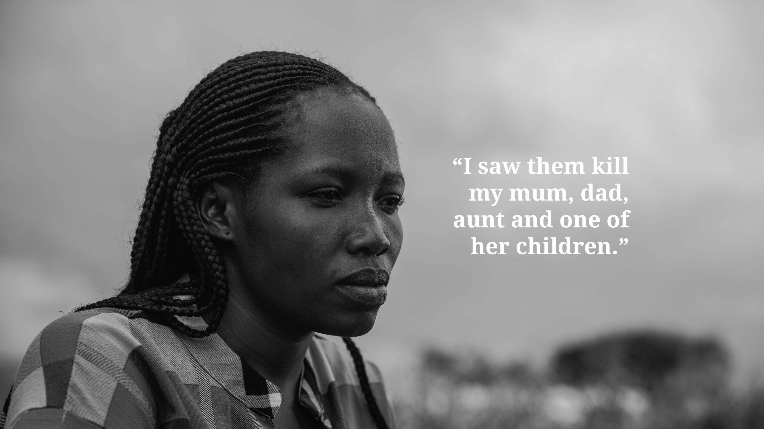 “Jag såg dem döda min mamma, pappa, moster och ett av hennes barn. Alla i byn hade fått veta att de skulle ha en skjutövning, så när vi hörde skotten så trodde vi inte att det var något farligt. Men skottlossningen ökade i intensitet, och det visade sig att det var en ren attack.”