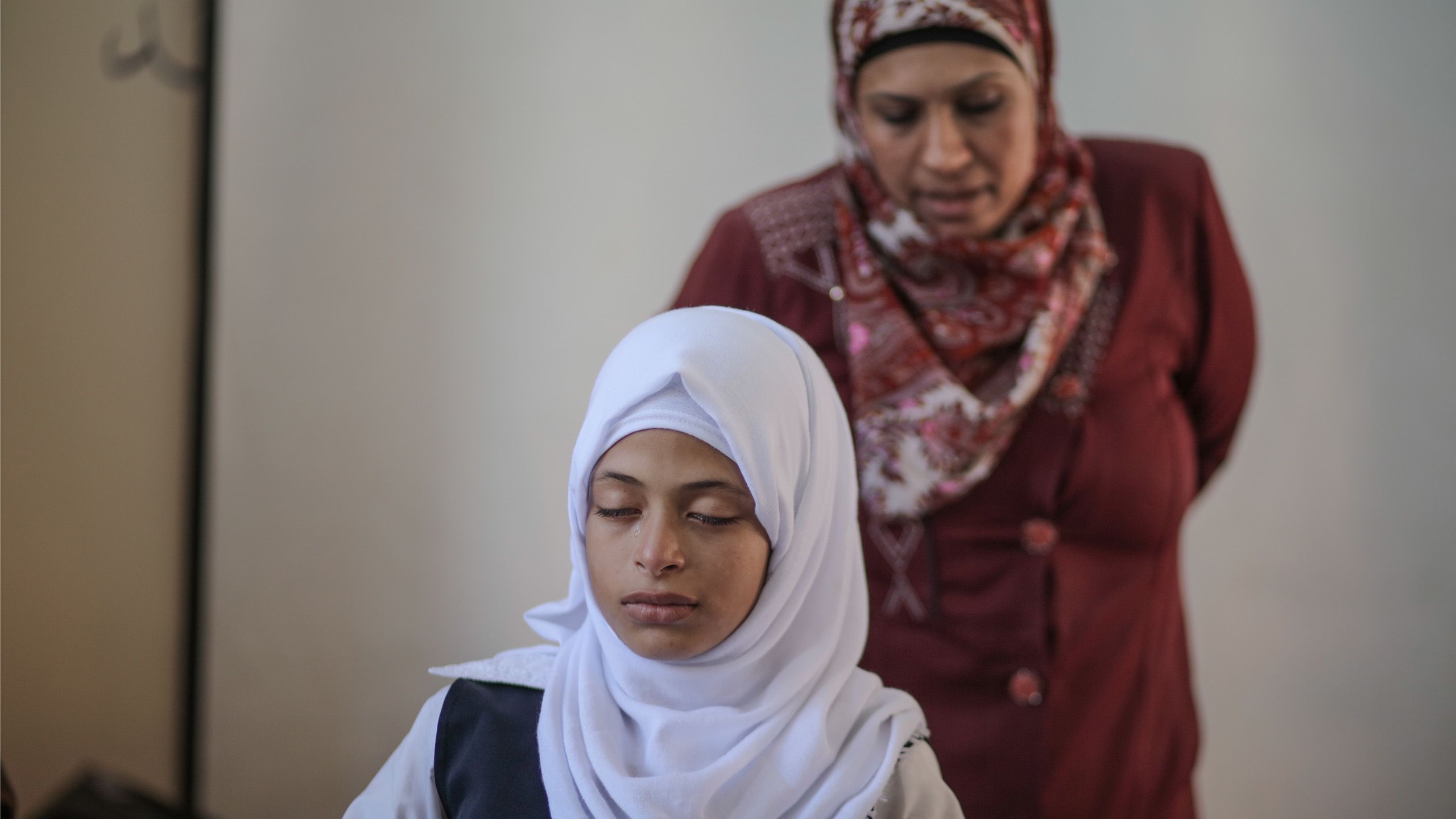 2017: Läraren Rania har fått utbildning av NRC Flyktinghjälpen i att hjälpa barn som kämpar med stress, trauma och mardrömmar. Här visar hon avslappningsövningar för eleverna.