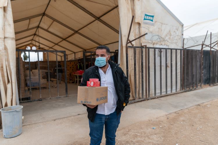 Förutom kontanter hämtar Karim även tvålpaket och hygienartiklar vid NRC Flyktinghjälpens distributionscentral. Foto: Beate Simarud/NRC Flyktinghjälpen